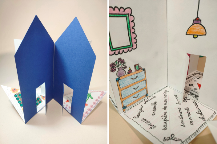 Ces maisons en 3 dimensions ont été créées dans le cadre d'un projet alliant pratique de la langue et pratique artistique. Elles évoquent l'actuel, le passé, mais aussi la maison rêvée. Elles en disent long sur les valeurs, les traditions, les modes de vie, l'histoire du pays d'origine au pays d'accueil. Les textes qui ont été écrits sont accessibles via le lien. Ce projet a été mené en partenariat avec l'association Du Vent Dans Les Mots, Claire Gouelleu et Cyprienne Kemp.